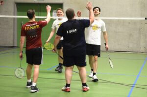 Naast lekker eten natuurlijk ook badminton. Gezellig badminton! 330 wedstrijden werden gespeeld door 252 spelers in die typische aangename sfeer van een recreantentornooi. Alle leeftijden door elkaar, niveau steeds gelijkwaardig en sfeer vriendschappelijk. En zo hoort dat!